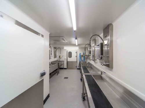 Elle a été restructurée totalement pour la fabrication de 5 500 repas en liaison froide positive en conditionnement réemployable avec création de monte-charges pour livraison et envoi.