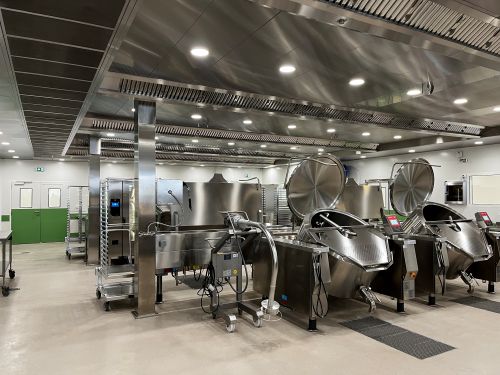 Cuisine centrale en liaison froide, conditionnement en bacs inox réutilisables avec mécanisation. Intégration d’une légumerie. Parcours pédagogique.